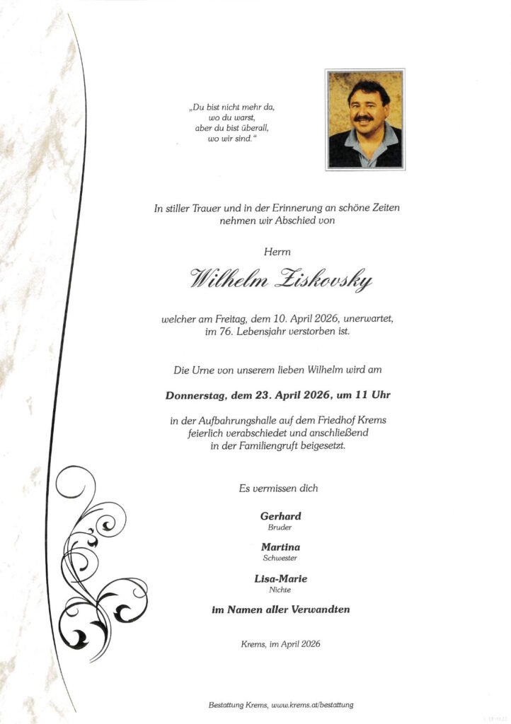 Mit tiefem Bedauern nehmen wir Abschied von unserem geschätzten Kollegen Wilhelm Ziskovsky, der am 10.4. im 76. Lebensjahr von uns gegangen ist.