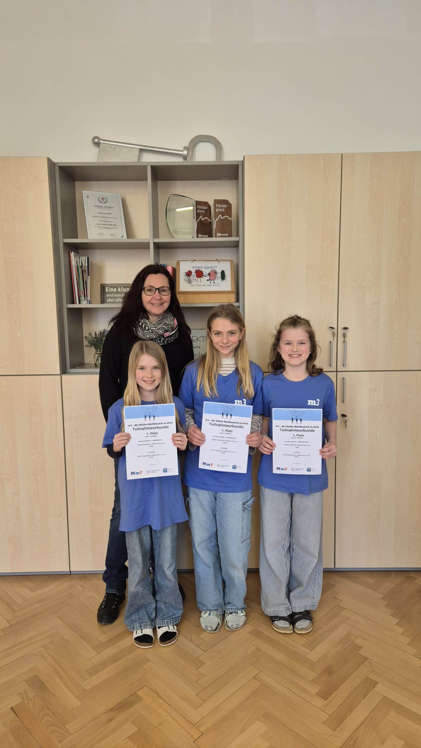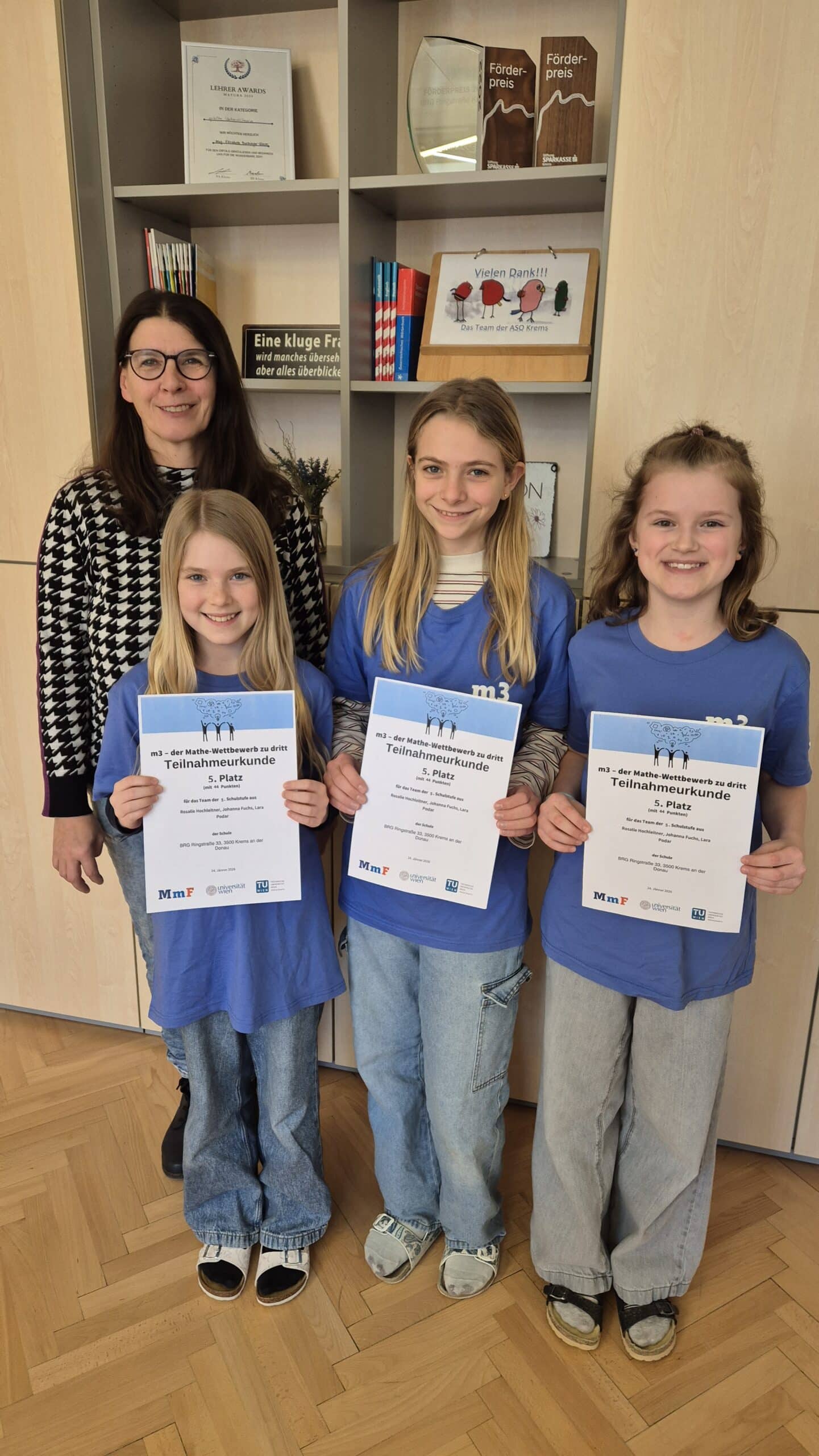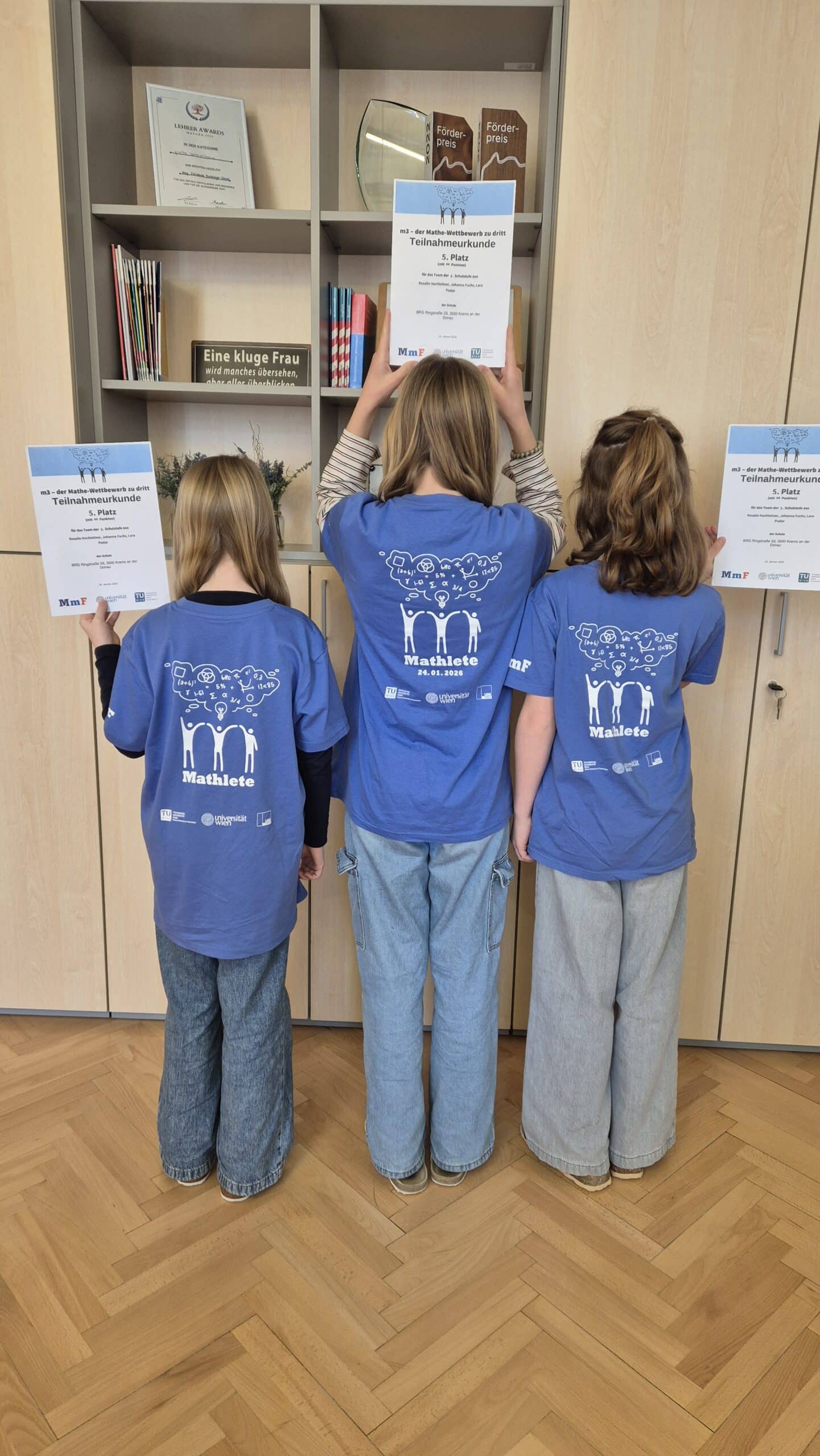 Bereits in der ersten Klasse Uniluft schnuppern und sich in einem Hörsaal mit kniffeligen Aufgaben auseinandersetzen? Dass das geht, hat ein Dreierteam der Klasse 1C erfolgreich bewiesen. Johanna Fuchs, Rosalie Hochleitner und Lara Podar haben sich in Begleitung ihrer Klassenvorständin Sybille Kagerer der Herausforderung gestellt und beim Mathematikwettbewerb der Universität Wien den fünften Platz in ihrer Schulstufe errechnet. Die Schulgemeinschaft gratuliert ihnen herzlichst zu diesem hervorragenden Ergebnis!