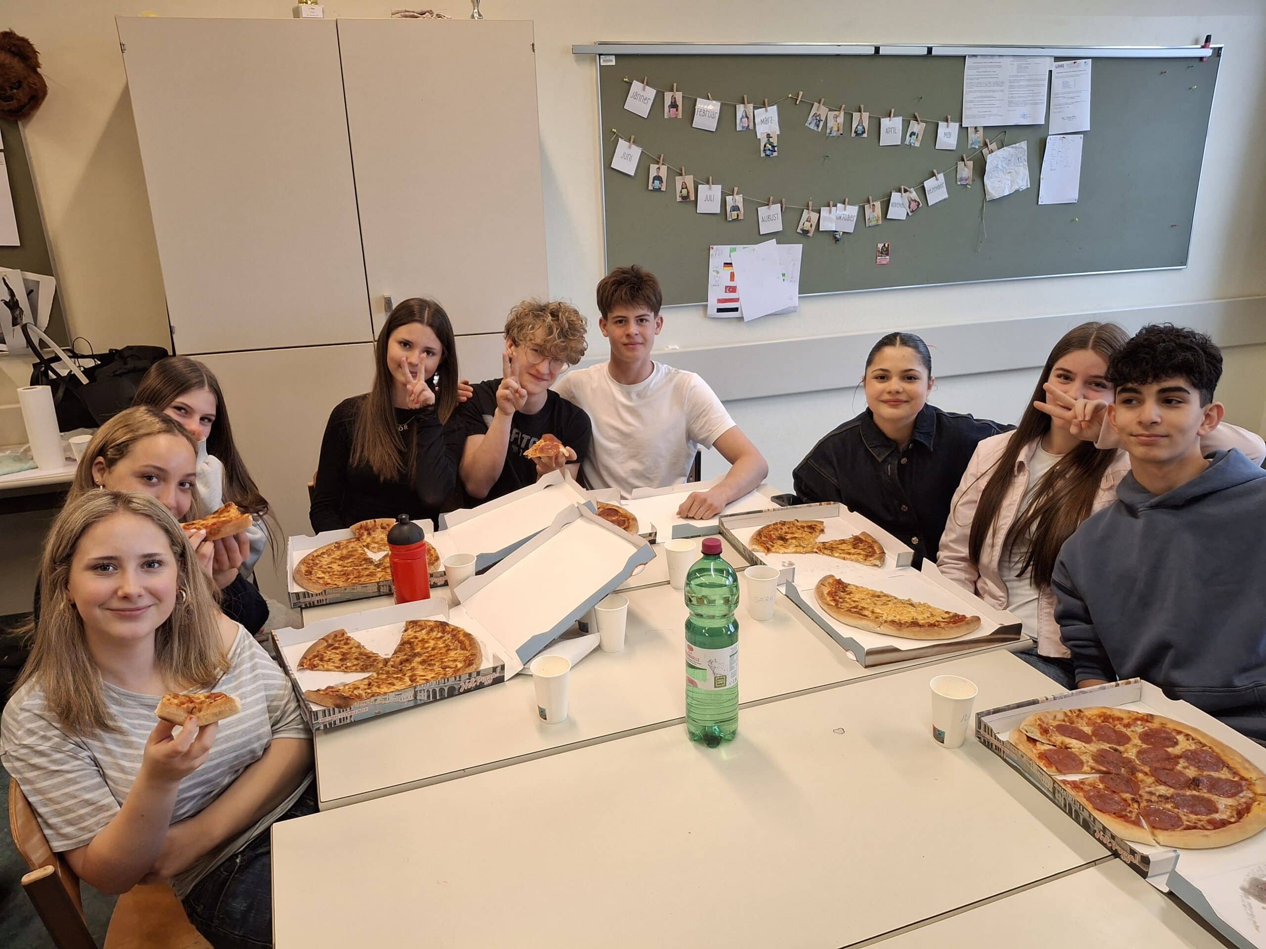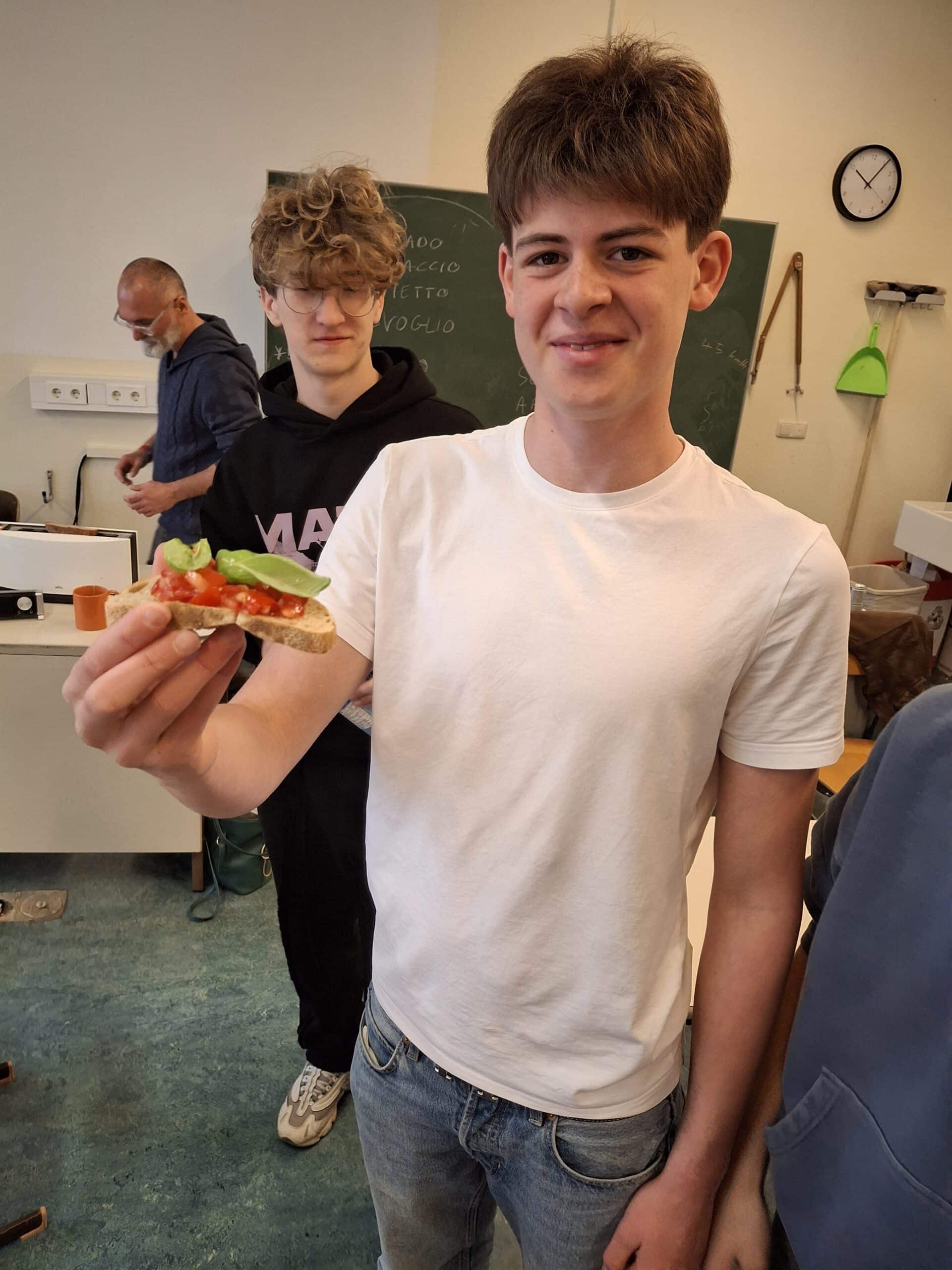 Zum Abschluss am letzten Tag konnten alle gemeinsam ein bekanntes italienisches Gericht zubereiten: la Bruschetta, … und eine Pizza genießen. Diese gelungene Sprachwoche stärkte den Teamgeist der Klasse und bot eine authentische Sprachpraxis im Kontext von Alltag und Kultur. Dass es am letzten Tag in Krems sogar geschneit hat, bot eine „sensazione speciale“: la pizza, la bruschetta e la neve (Schnee). Ein herzliches Dankeschön an Francesco, der sehr schnell die Herzen der Schülerinnen und Schüler gewann und wir freuen uns auf weitere „incontri italiani“.