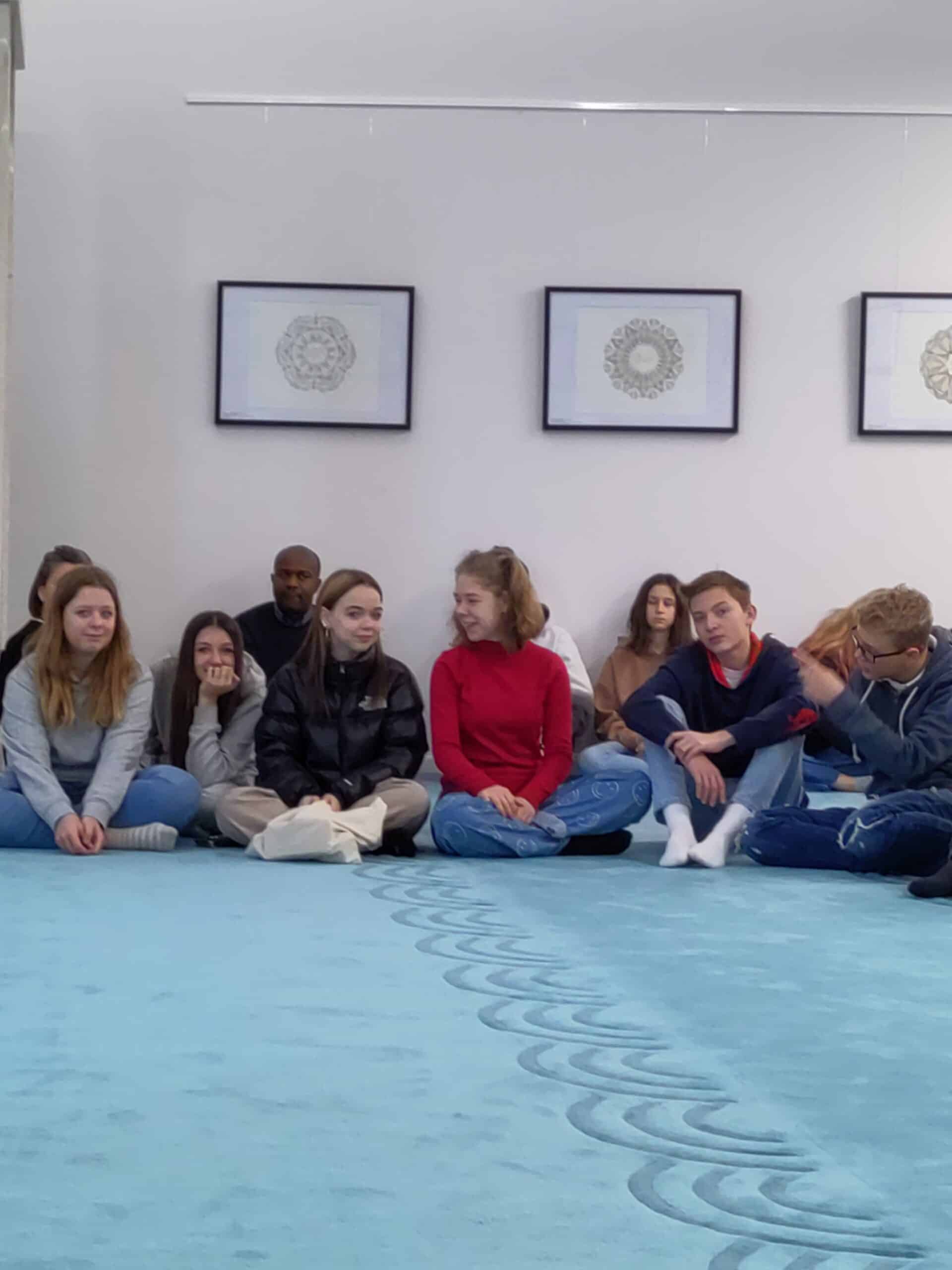 Fast wäre die Gruppe an der Moschee in Tulln vorbei gegangen, weil sie sich vollkommen in die Umgebung einfügt und wie ein größeres Einfamilienhaus wirkt. Imam Senad Kusur erklärte dann, dass dies einerseits aus ökonomischen Gründen so geplant war, aber auch weil die Architektur einer Moschee nicht theologisch festgeschrieben ist, denn der uns bekannte Kuppelbau kommt eigentlich aus dem byzantinischen Christentum. In Tulln ist der helle Bau mit klaren Linien sowohl für die ansässigen Muslime als auch Besucher sehr einladend. Die Schüler:innen erfuhren über die Bedeutung der einzelnen Gebetshaltungen, denn „der Muslim betet mit dem Körper“ und ihre Fragen z.B. über das Tragen des Kopftuchs wurden kompetent beantwortet.