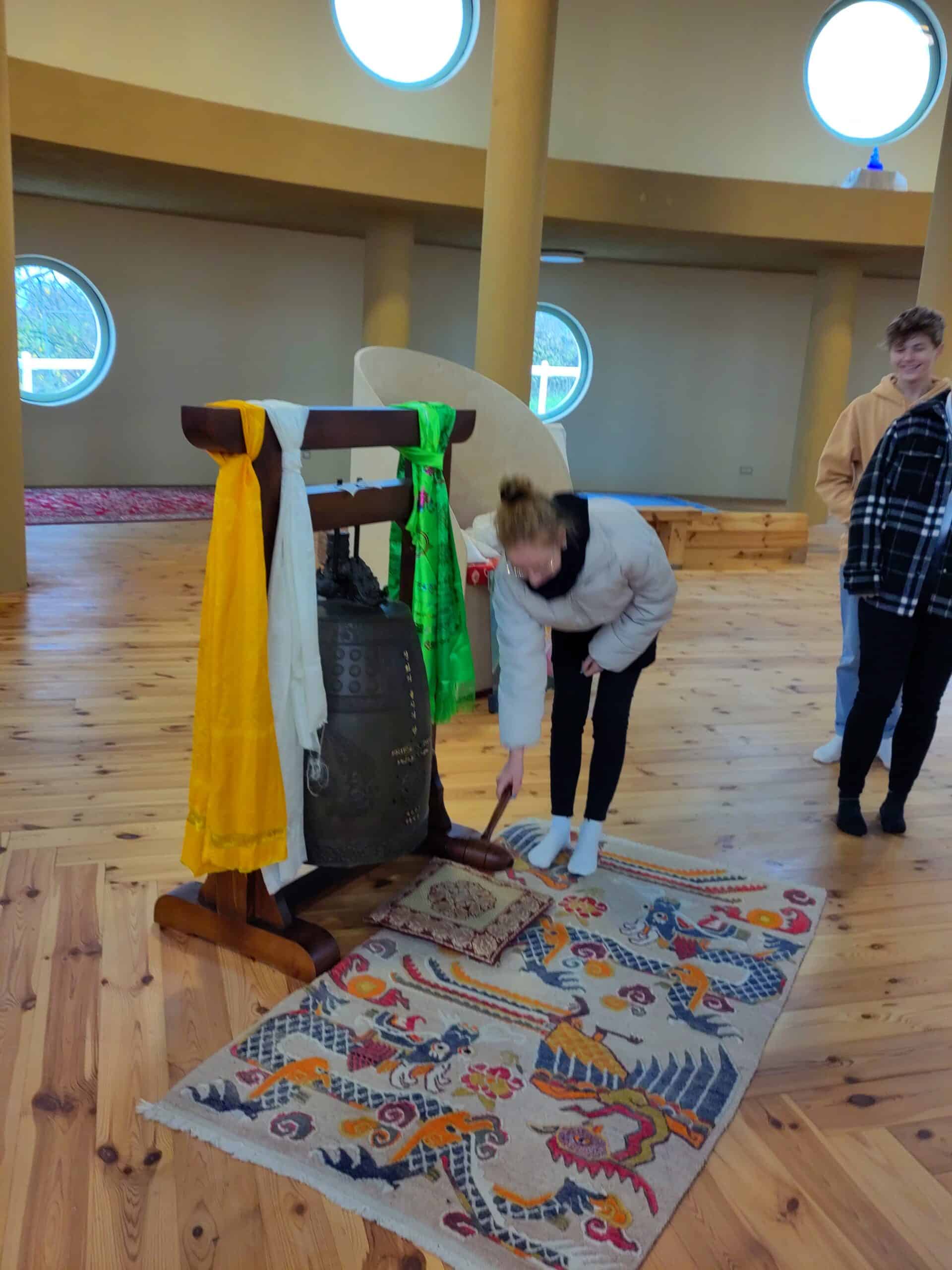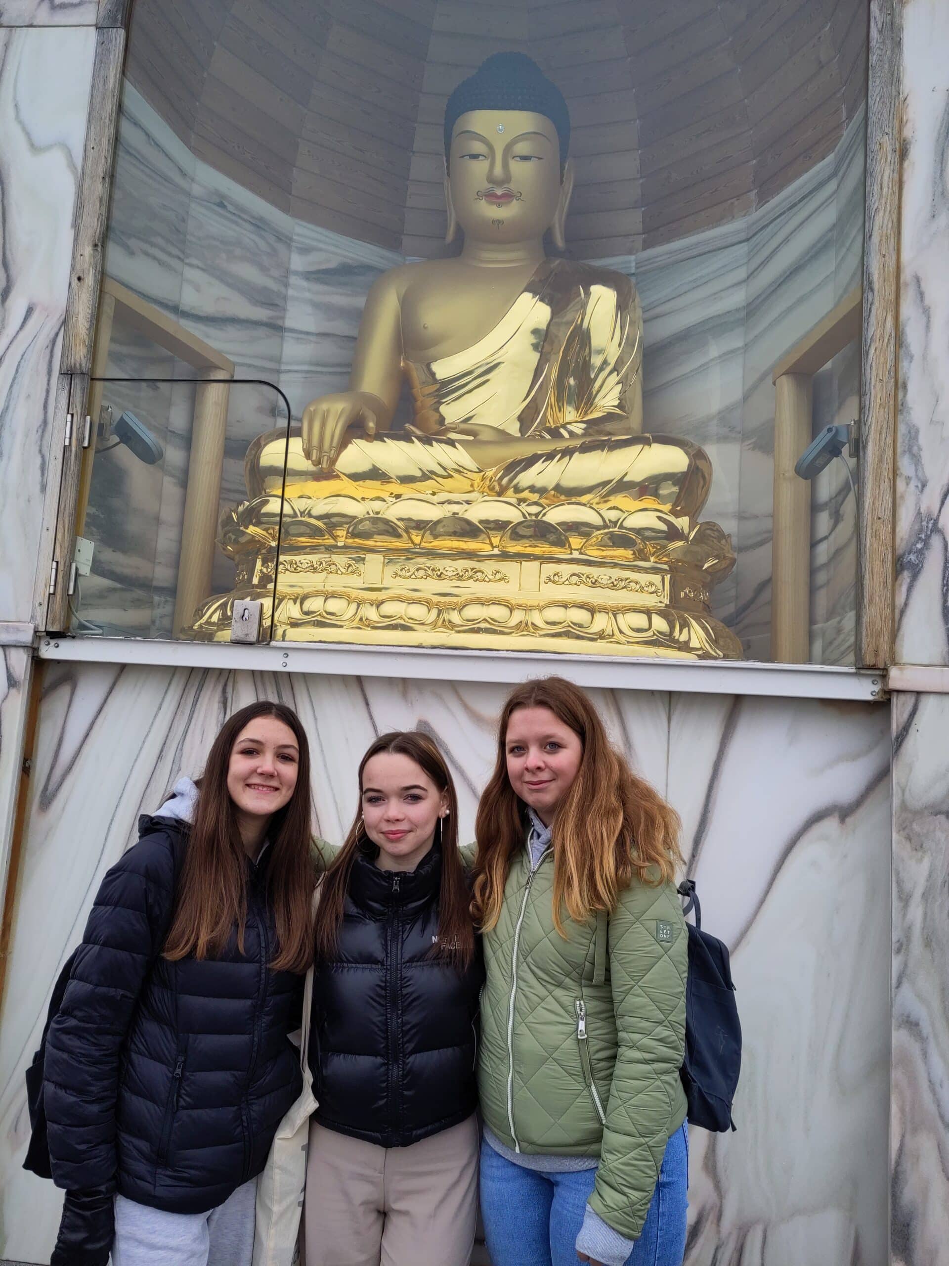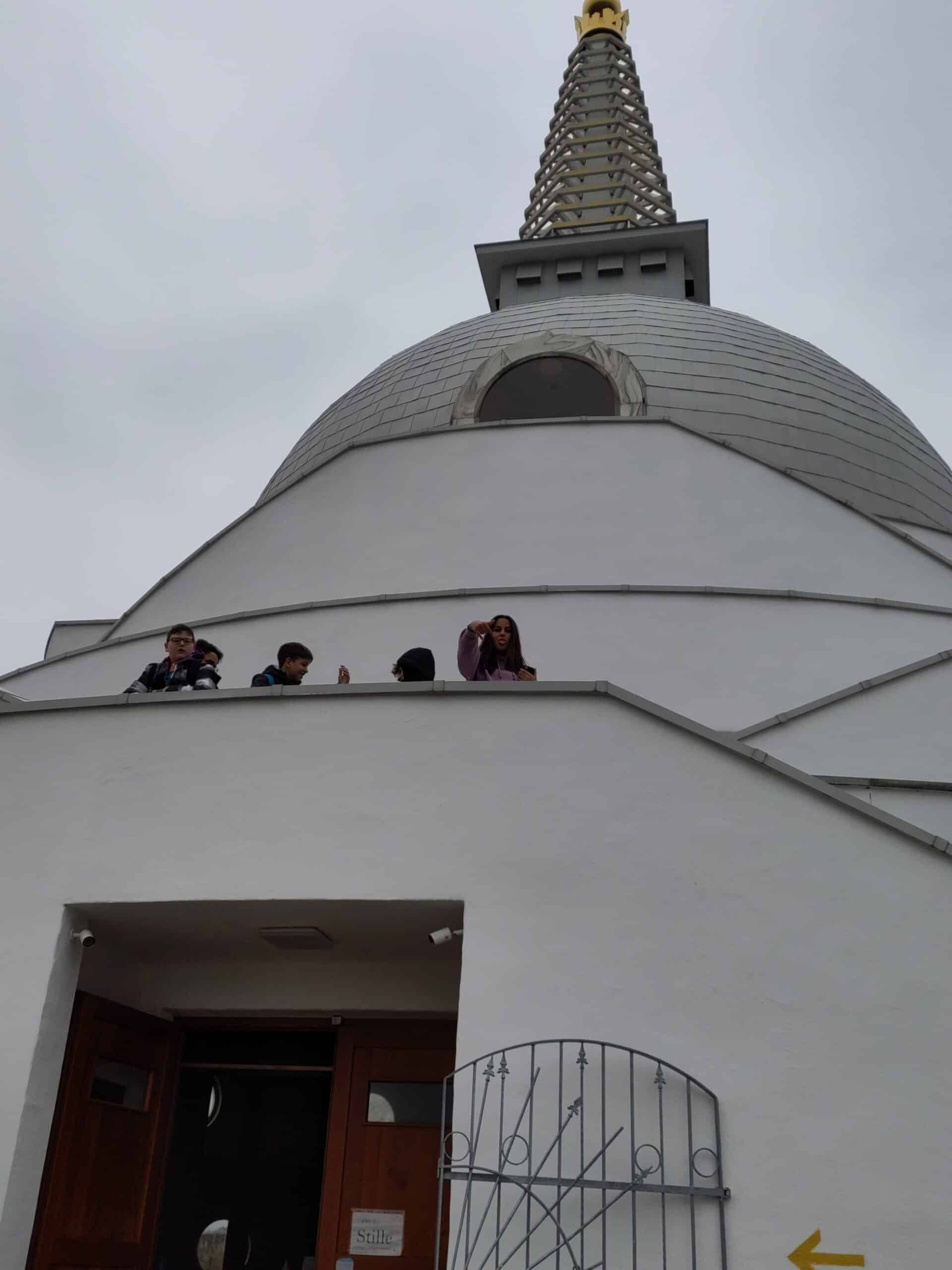 Dann ging es nach einer kurzen Zugfahrt auf einem Fußweg durch die Weingärten weiter zum Stupa, der imposant über der Landschaft thront. Mönch Sunim erklärte die verschiedenen Buddha-Statuen und bat die Jugendlichen, die Friedensglocke zu läuten, denn gerade jetzt brauchen wir ein Zeichen gegen den Krieg. Durch das vom Mönch gesungene Lotus-Mantra bekam die Gruppe einen ersten Einblick in die buddhistischen Rituale, zu dem auch das Umrunden des Stupa gehört. Dabei wird man mit einem weiten Ausblick belohnt und kann der großen goldenen Buddha – Statue in die Augen sehen.