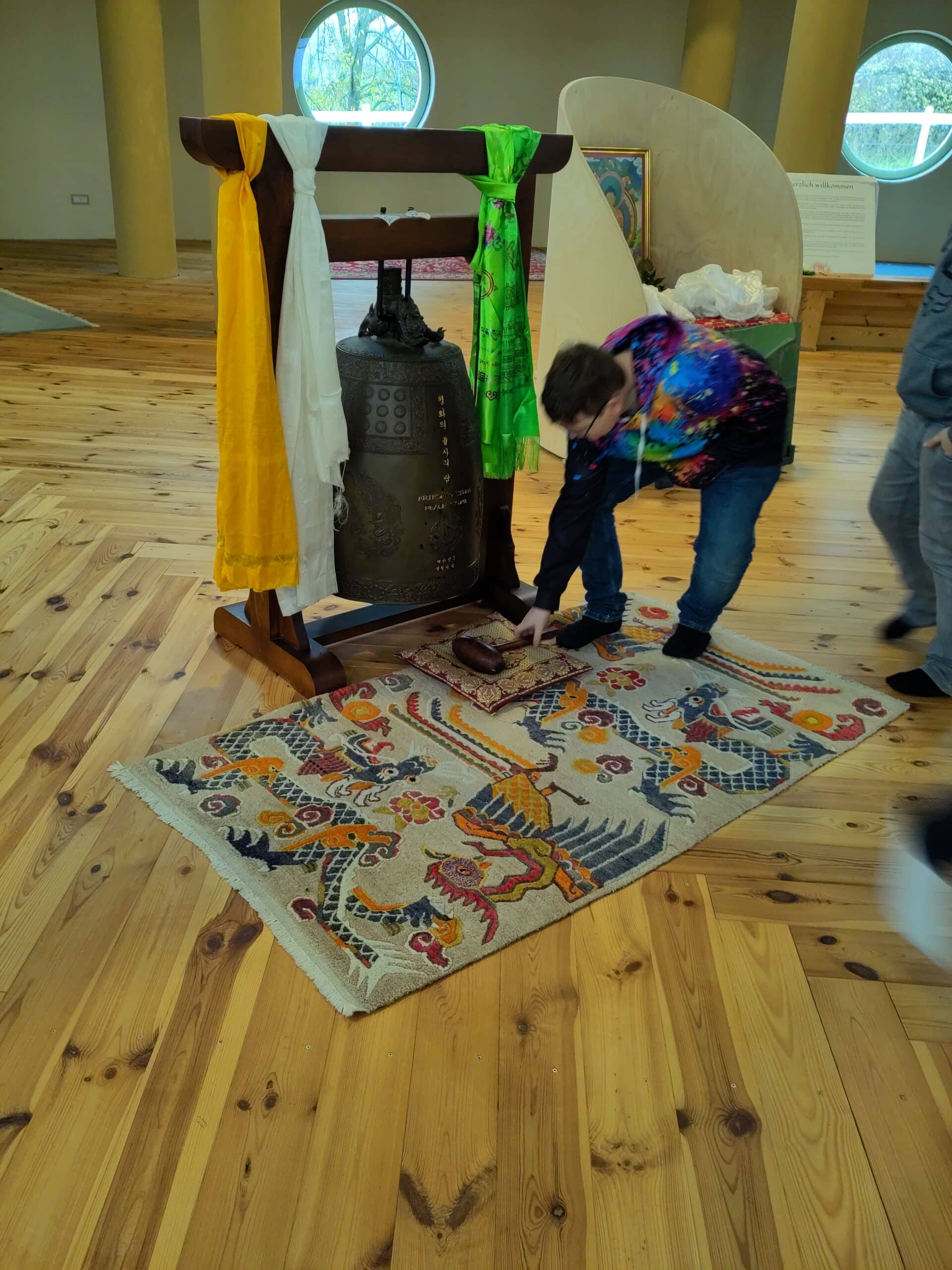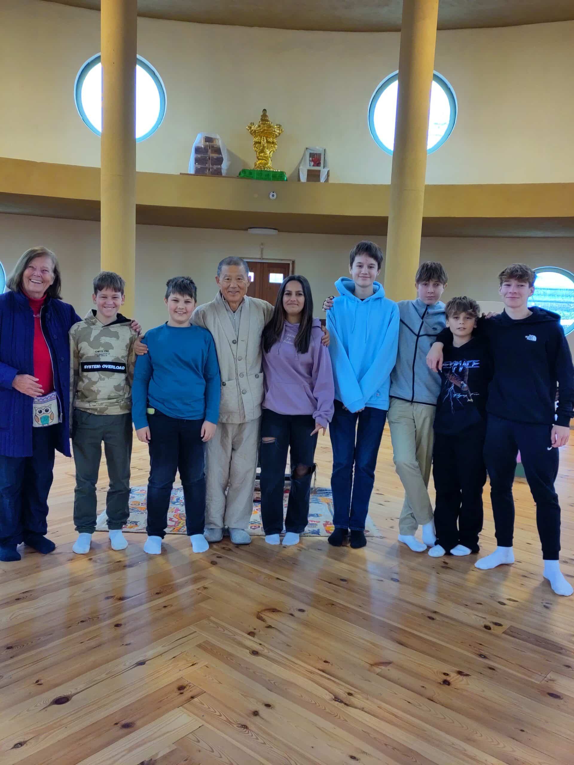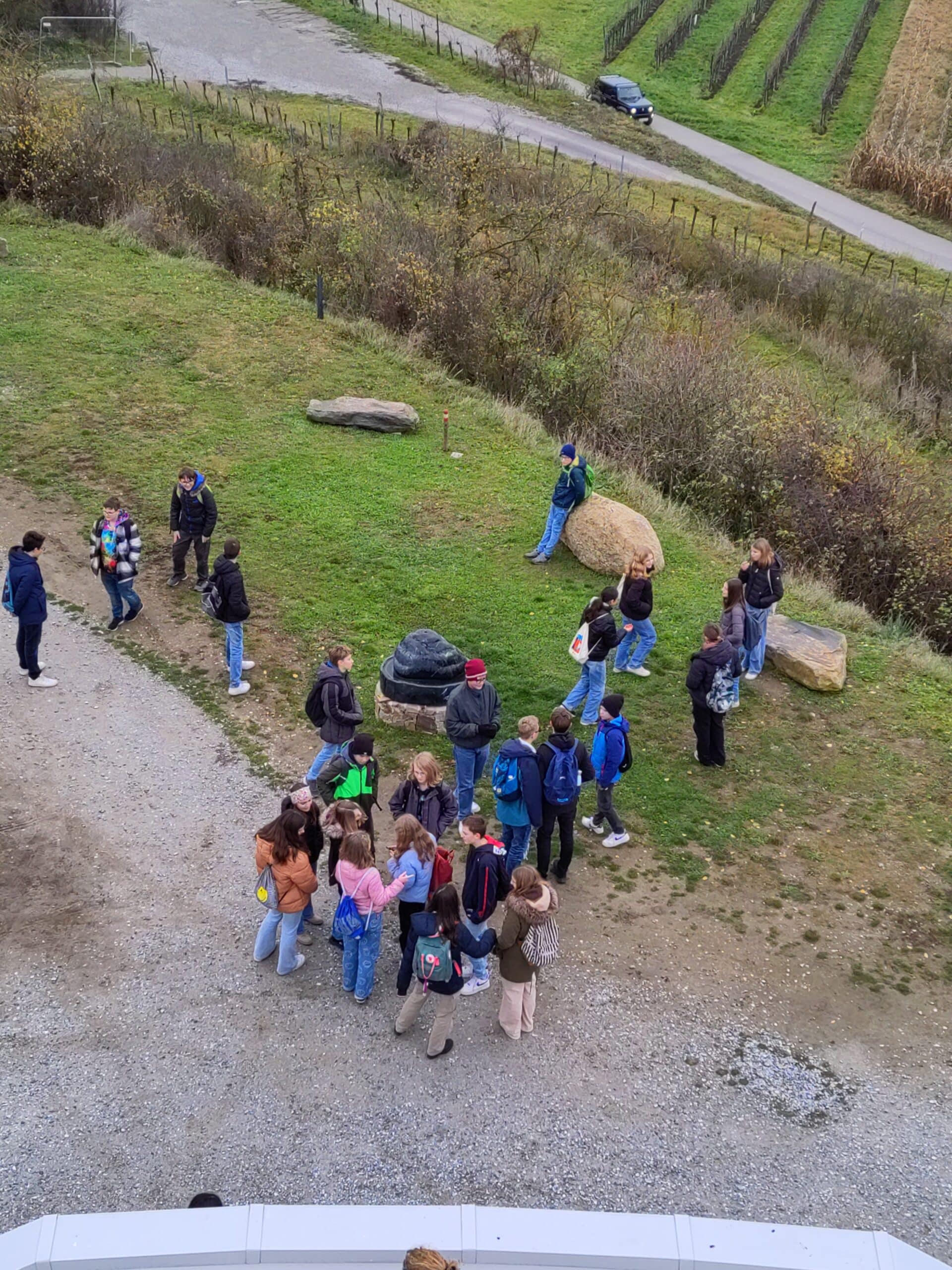 Dann ging es nach einer kurzen Zugfahrt auf einem Fußweg durch die Weingärten weiter zum Stupa, der imposant über der Landschaft thront. Mönch Sunim erklärte die verschiedenen Buddha-Statuen und bat die Jugendlichen, die Friedensglocke zu läuten, denn gerade jetzt brauchen wir ein Zeichen gegen den Krieg. Durch das vom Mönch gesungene Lotus-Mantra bekam die Gruppe einen ersten Einblick in die buddhistischen Rituale, zu dem auch das Umrunden des Stupa gehört. Dabei wird man mit einem weiten Ausblick belohnt und kann der großen goldenen Buddha – Statue in die Augen sehen.